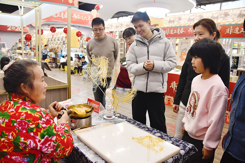 图书大厦在三层设置古琴斫制、葫芦烙画、李家布艺、糖画、皮影戏、朱砂画、麻子石陶器等非遗项目展示区。非物质文化遗产古琴艺术(古琴斫制)代表性传承人李云峰老师现场讲解这项古老技艺,并弹奏《阳关三叠》《酒狂》等经典曲目,空灵悠远的琴声让读者体悟非遗技艺的千年匠心; 糖人(画)非遗技艺传承人王冬兰现场精心制作寓意吉祥的糖画作品,同时满足读者的个性化需求,互动有趣的形式,吸引小朋友们踊跃参与,让非遗技艺在创新体验中走进大众、融入日常。裕华路店的棋类体验区,读者们在“鼎棋”棋盘上排兵布阵,感受这一本土特色棋类项目的智慧碰撞;手工体验区内,“绒花制作技艺”用丝绒编织出吉祥花卉,寓意荣华常在;“夏氏面塑”则通过揉捏搓捻,让彩色面团瞬间幻化成鲜活的艺术形象。