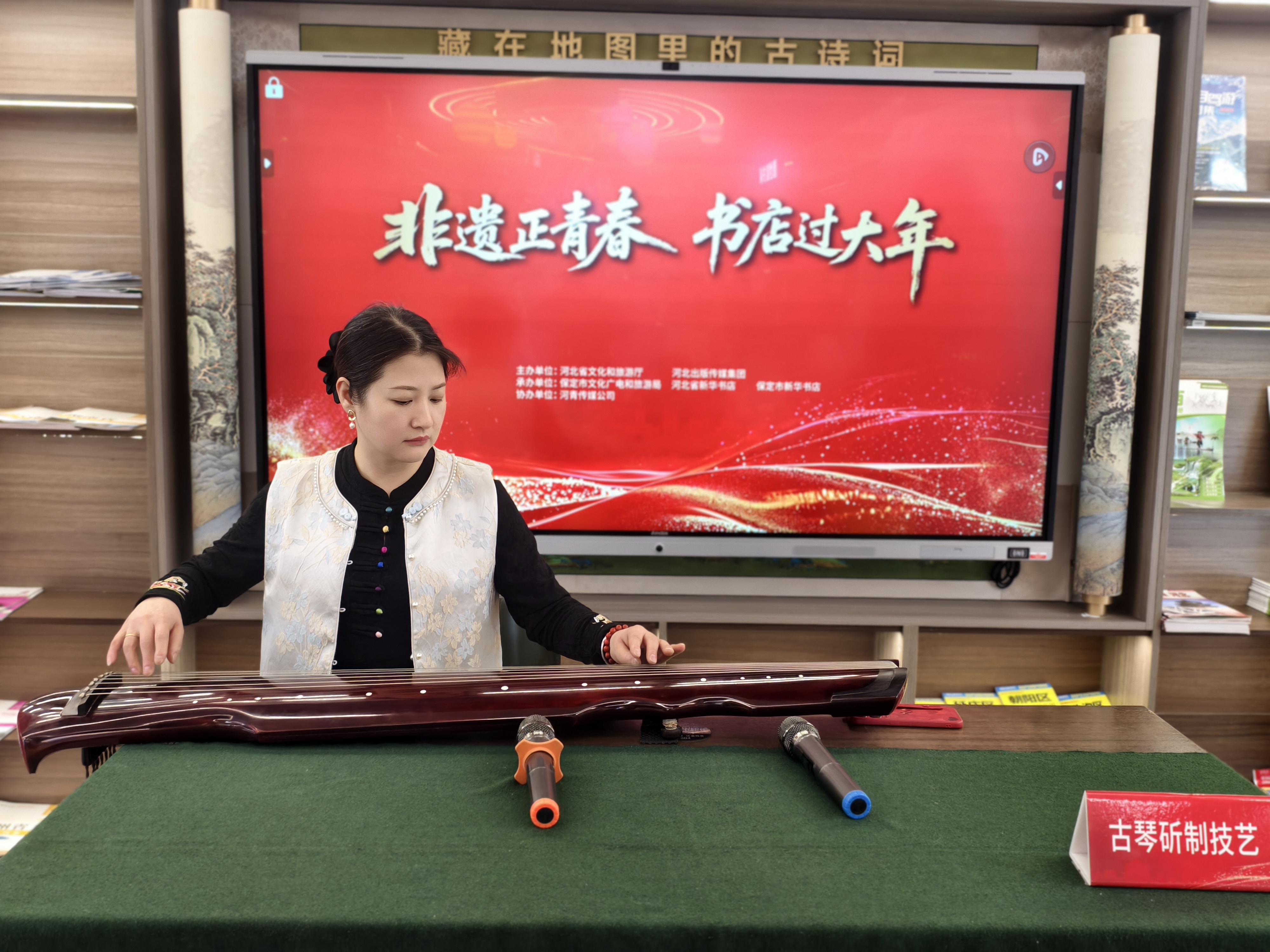 市店图书大厦在三楼活动区设置古琴斫制、糖人(画)传统吹制、清苑木原朝手工布艺(李家布艺)、葫芦烙画、麻子石陶器烧制、朱砂画、皮影戏等展示区,现场读者热情互动。保定市皮影戏传承人贾国艳老师带来的经典片段《红灯记》表演备受关注,悠扬的乐声响起,贾老师手中的皮影灵活翻转、翻腾跳跃,幕布之上人物神态生动、动作流畅,道具场景精巧逼真,活灵活现的表演引得现场大小读者目不转睛、阵阵喝彩。表演结束后,贾老师邀请读者亲身体验操控皮影,向大家细致讲解皮影制作工艺,孩子们好奇地围在四周,伸手轻触皮影灵动的关节,纷纷为这门古老技艺的精巧绝伦发出惊叹。看到孩子们对皮影戏充满热情、积极参与体验,贾国艳老师倍感欣慰:“在书店里演绎皮影戏,身旁是满架书香,台下是天真孩童,今天让孩子们亲手触摸、亲身参与,就是在他们心中种下非遗传承的种子,让老手艺得以代代相传。”
